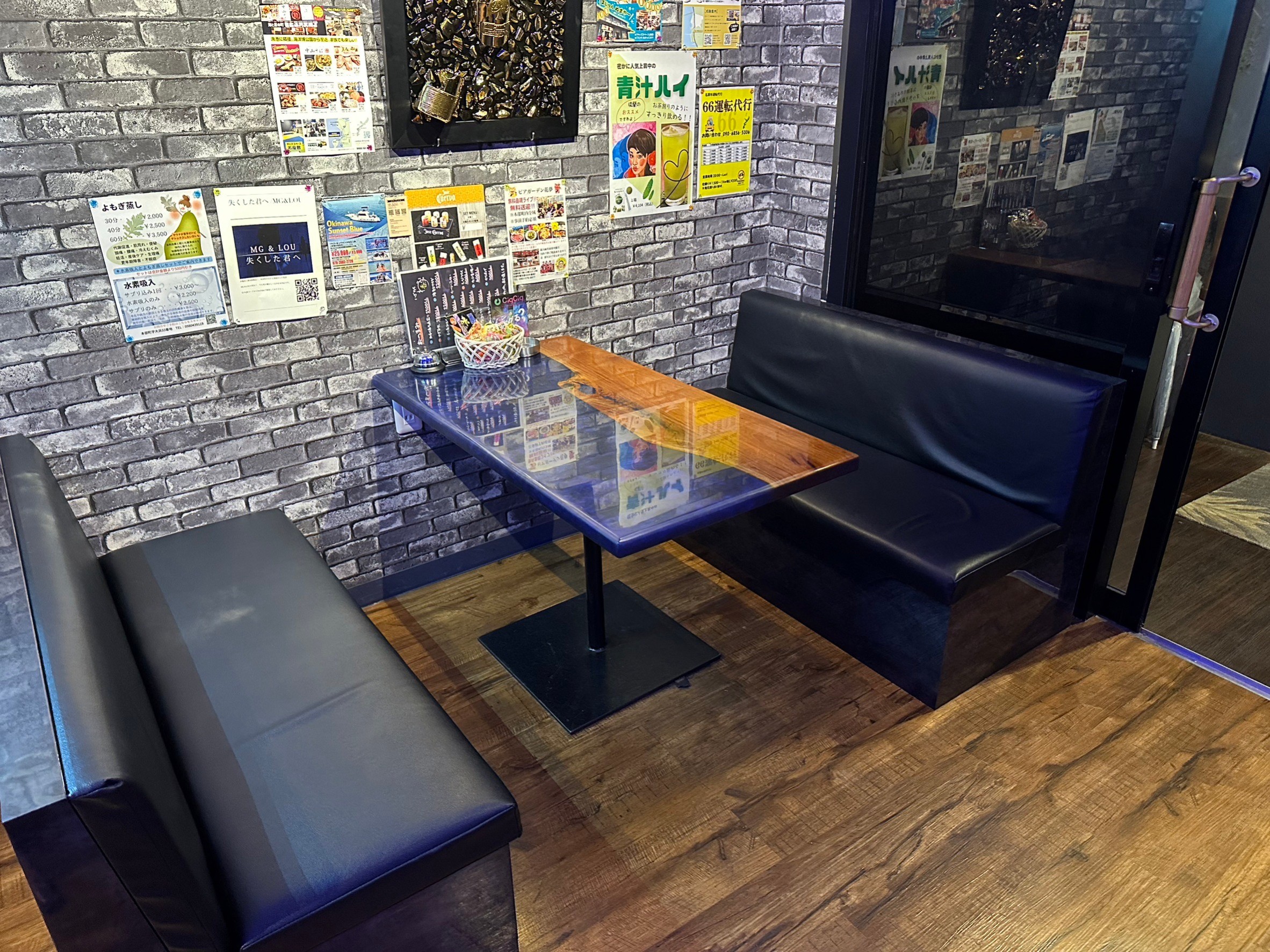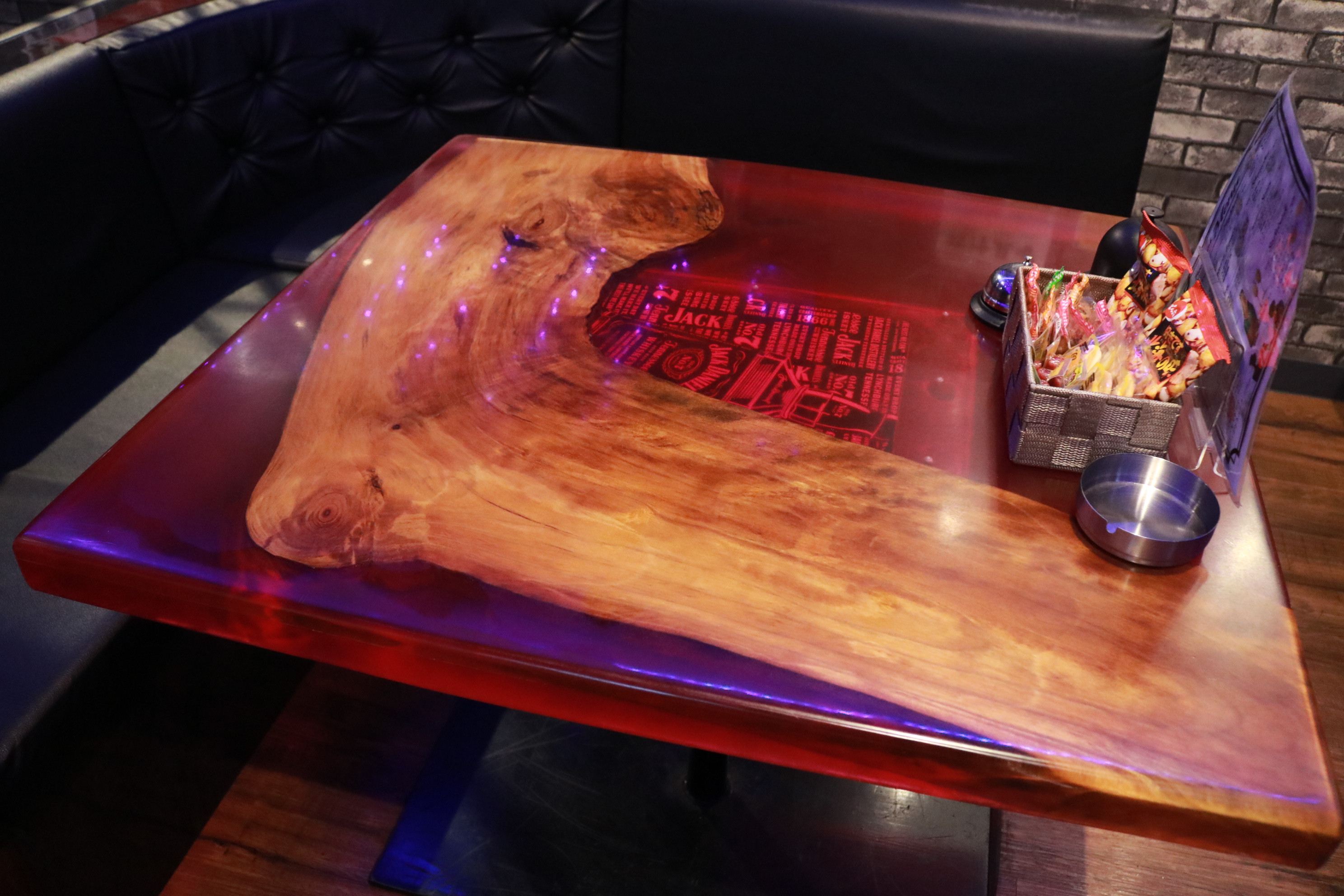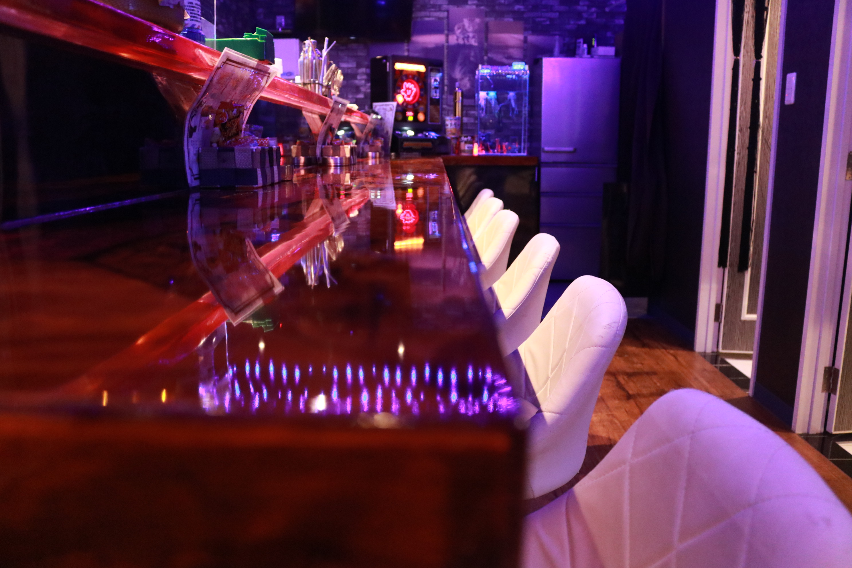 オーナーが自ら製作したこのテーブルや椅子などは、『レジン素材』で製作されています。レジン素材は透明感のあるつややかな質感が特徴で、デザイン性にとにかくこだわっています。お酒を飲んで楽しい時間を過ごすこととは別に、製作したオリジナルな作りの内装もぜひお楽しみください。